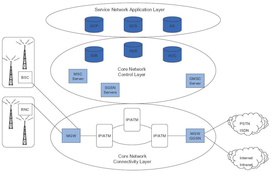 Layered UMTS Core Network Architecture The architecture of the core network for UMTS is shown is Figure 35, this illustrates the way to evolve this multi-network situation in order to overcome some of the existing defects. In short the UMTS solution is based on a horizontalisation of the core network into a number of independent networks. Basically UMTS is a “Network of Networks” (Personal Comment). Special Media Gateways (MGW), controlled by specific network servers, adapt and connect different access types to a common backbone network. End user applications are provided by a specific service layer, common to different access types. |