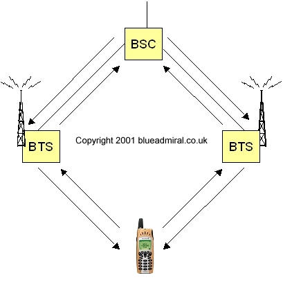 Soft Handovers Soft handovers with WCDMA are very different to the handovers used in the GSM system and this basic principle stems from the US system CDMA. Basically the MS is connected to more than one BTS (Base Station Transceiver) at a time. The reason for this is to reduce interference into other cells (BTSs). It also has the advantage of improving performance through macro diversity. Figure 34 illustrates a soft handover principle. The uplink signal fro the MS is received by both BTSs, which, after demodulation and combining, pass the signal forward to the combining point, typically this is the BSC. From a downlink point of view the same information is transmitted via both BTSs, and the MS receives the information from both of the BTSs as a separate multipath signals and can therefore combine them.